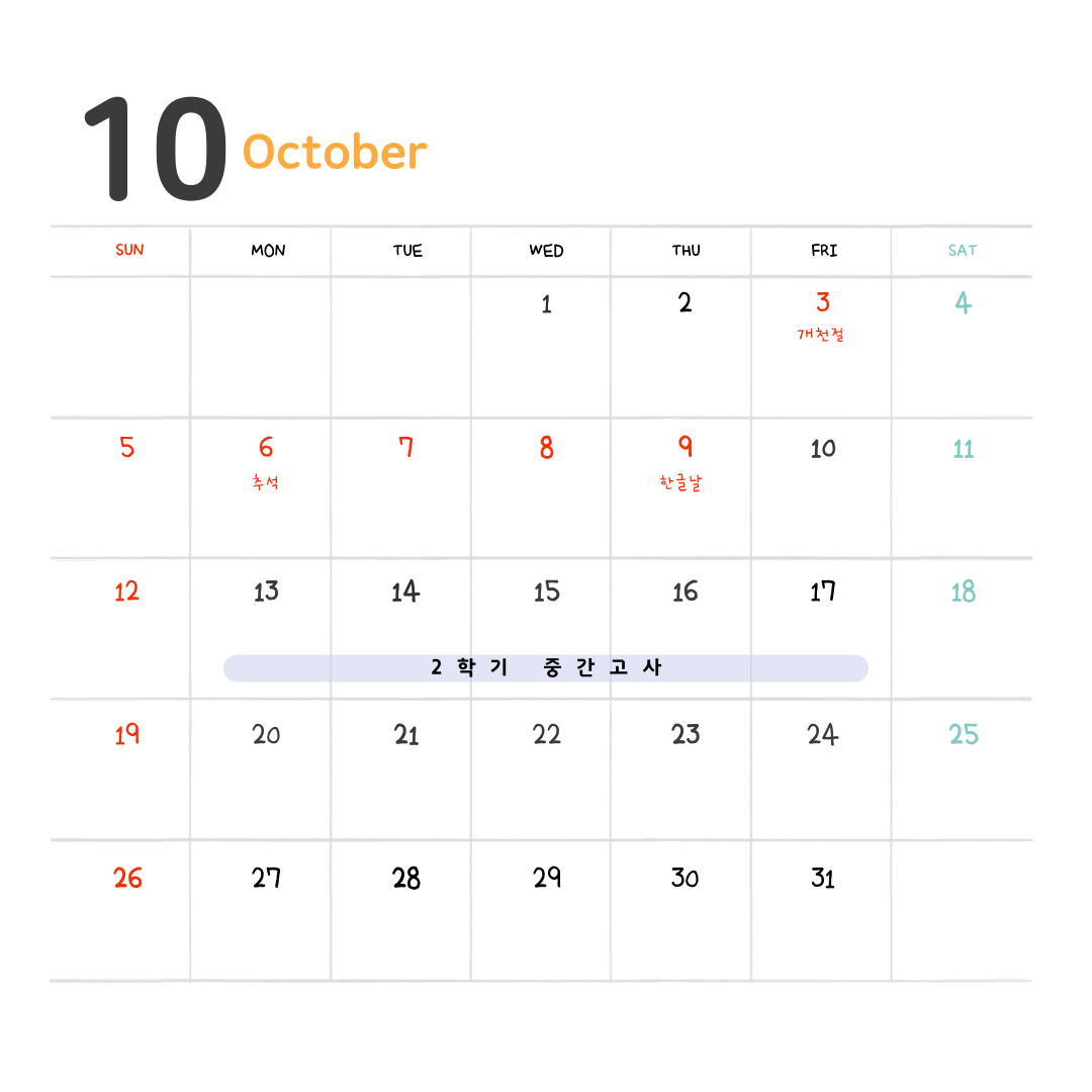 10월에는 개천절과 추석연휴, 한글날, 2학기 중간고사가 있습니다. 놓치는 일정 없도록 꼭 확인해주시길 바랍니다! 모두 시험공부 힘내시고 즐거운 추석 보내세요!!!