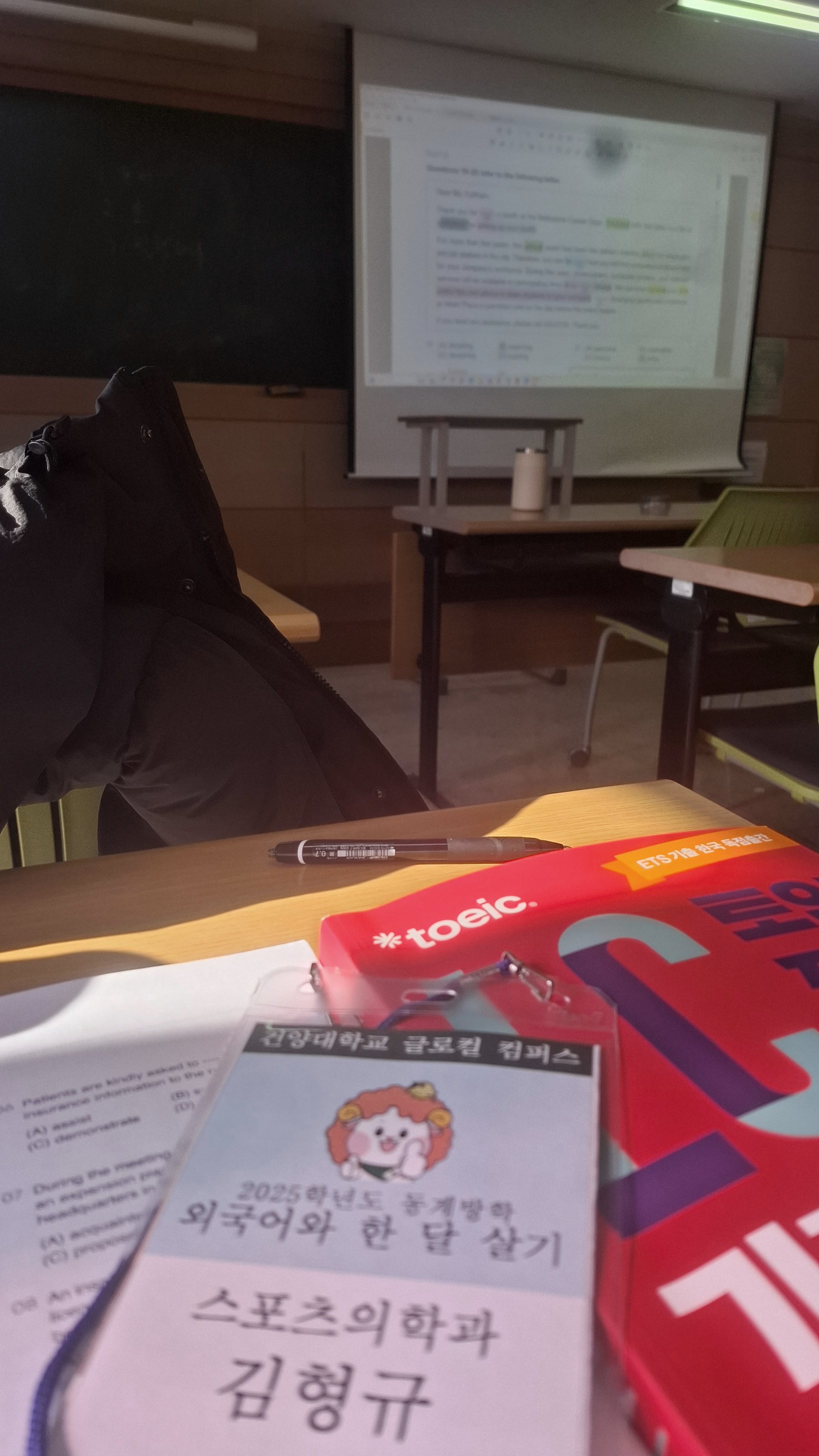 외국어와 한 달 살기 안녕하세요 건양대학교 스포츠의학과 학생회입니다 2025학년도 동계방학에 스포츠의학과 22학번 김형규 학우가 참여한 외국어와 한 달 살기 프로그램이 진행되었습니다. 토익 700점 목표반을 수강하였으며 체계적인 구성으로 이루어졌습니다. 학습 초반에는 LC와 RC의 기초 강의 위주의 형식으로 진행하고 후반에는 모의고사 등의 문제풀이 형식 위주의 프로그램이 진행되었습니다! 프로그램 진행 중 출결 및 단어 시험 성적 우수자로 선정되어 우수상을 수여받았으며 토익 시험에서 목표 점수에 다다르는 690점이라는 결과를 얻게 되었습니다. 방학 동안 외국어 능력을 향상시킬 수 있는 좋은 기회였습니다. 수고하셨습니다