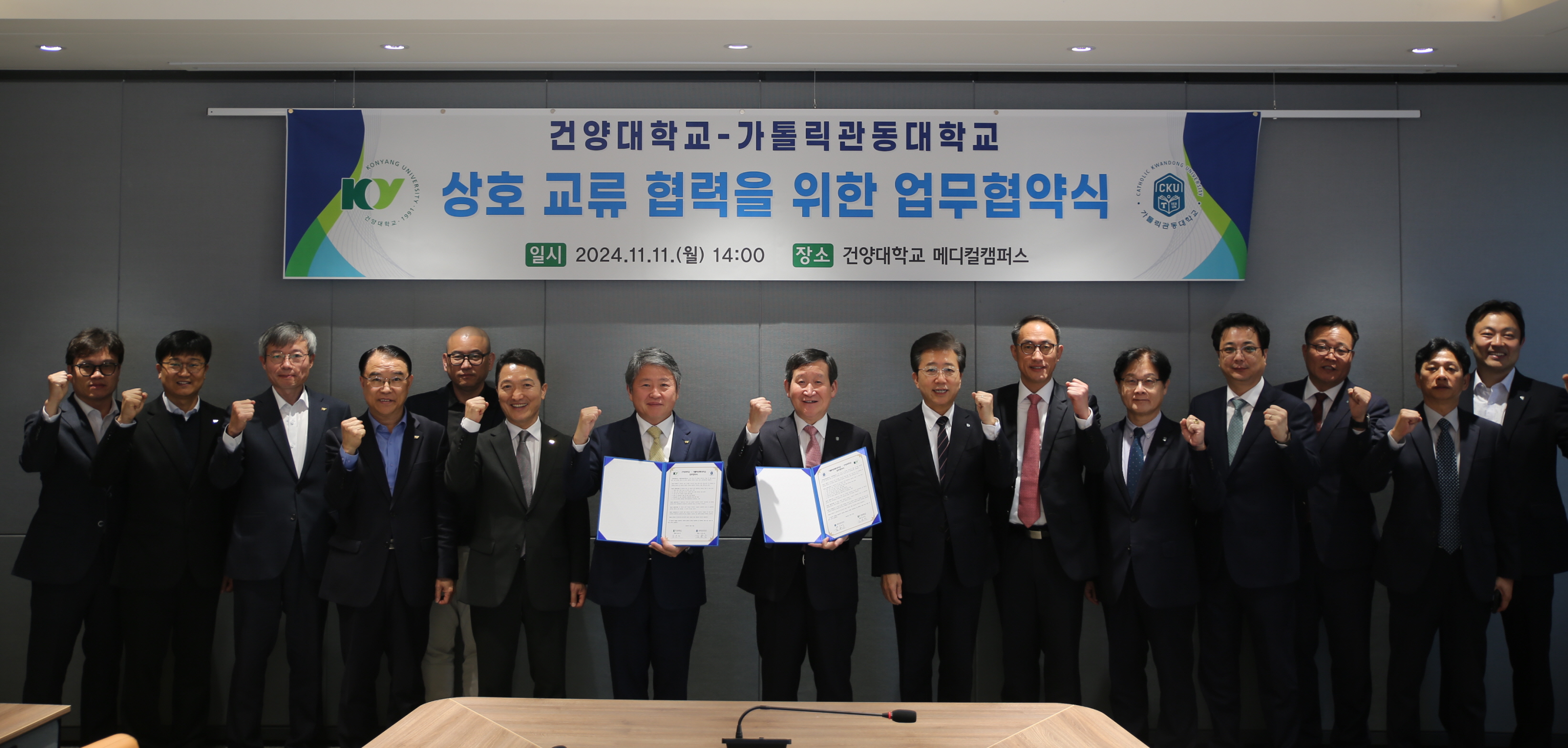 11일 열린 건양대와 관동대 업무협약 기념사진. 가운데 협약서를 든 김용하 건양대 총장(왼쪽)과 김용승 가톨릭관동대 총장 1.jpg