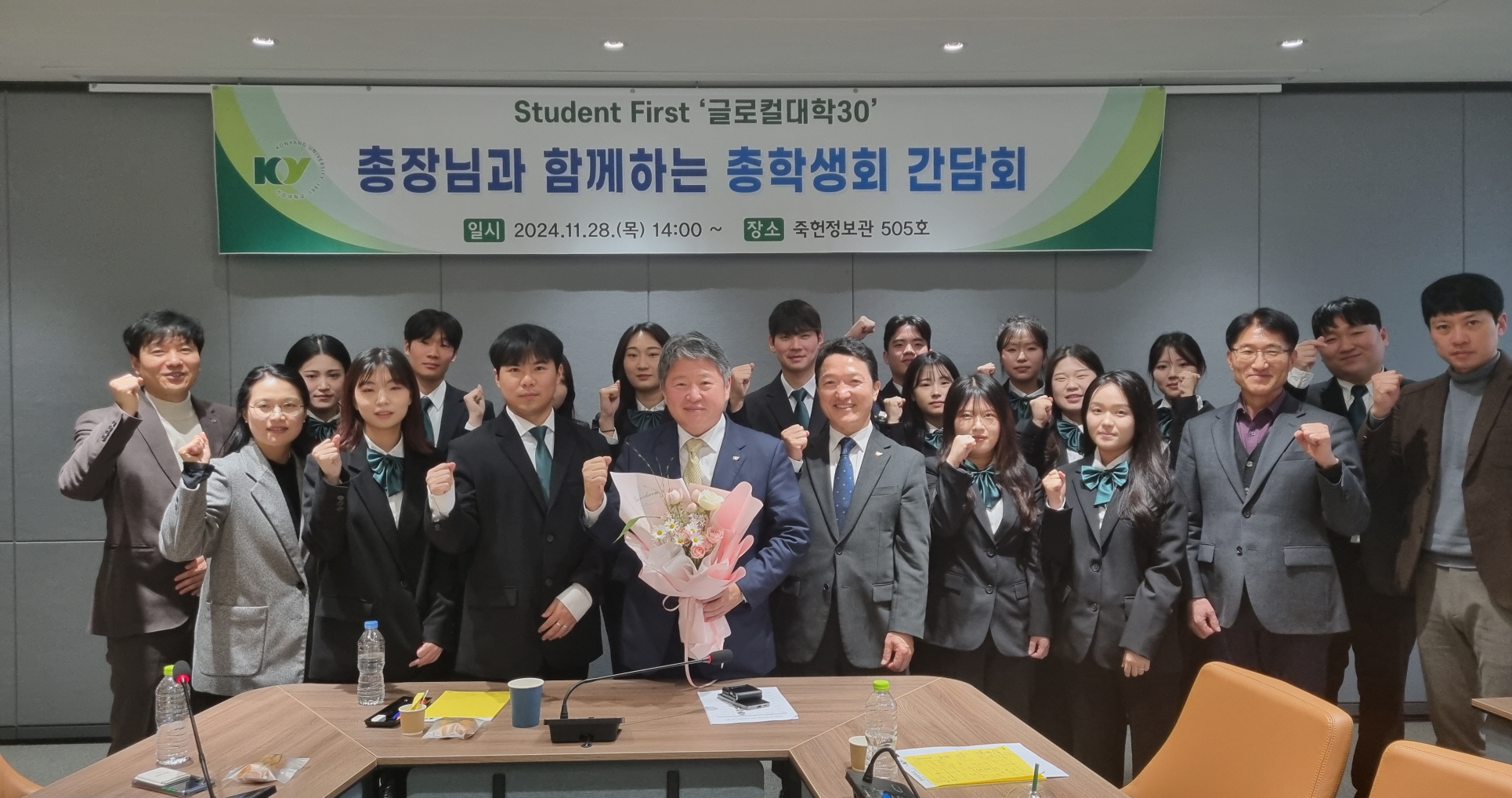 건양대-총학생회, 글로컬대학 사업 비전 공유하고 및 학생들 의견 청취 건양대학교(총장 김용하)는 28일 오후 대전 메디컬캠퍼스 죽헌정보관에서 2024학년도 총학생회 ‘그린’ 임원들과 김용하 총장, 최임수 부총장, 손승호 글로컬대학사업추진단 전략기획본부장이 참석한 가운데 총학생회 간담회를 진행했다. 이번 간담회는 2024년 한 해 동안 활동한 총학생회 그린이 임기 종료를 앞둔 가운데 그간의 노고를 치하하는 동시에 건양대 글로컬대학 사업에 대한 전반적인 설명과 추진방향에 대한 공유, 학생들의 건의사항 및 질의와 토론시간 등으로 이뤄졌다. 이 자리에서 그린 총학생회 이병현 회장은 “글로컬대학 사업이 선정된 것에 자부심을 느낀다”며 “앞으로 사업운영으로 인해 많은 변화들이 있을텐데 재학생의 불이익을 최소화하고 이 사업을 계기로 학생들을 위한 학업환경 및 제도 개선이 이뤄져 발전하는 대학으로 나아가길 바란다”고 밝혔다. 건양대 김용하 총장은 “창의융합캠퍼스와 메디컬캠퍼스 양 캠퍼스 어느 한 쪽도 소홀히 하지 않고 함께 환경을 개선하고 발전시켜 나가도록 노력하겠다”며 “학생이 최우선인 대학, 학생들이 즐겁게 다닐 수 있는 대학으로 발전시켜나가겠다”고 말했다.
