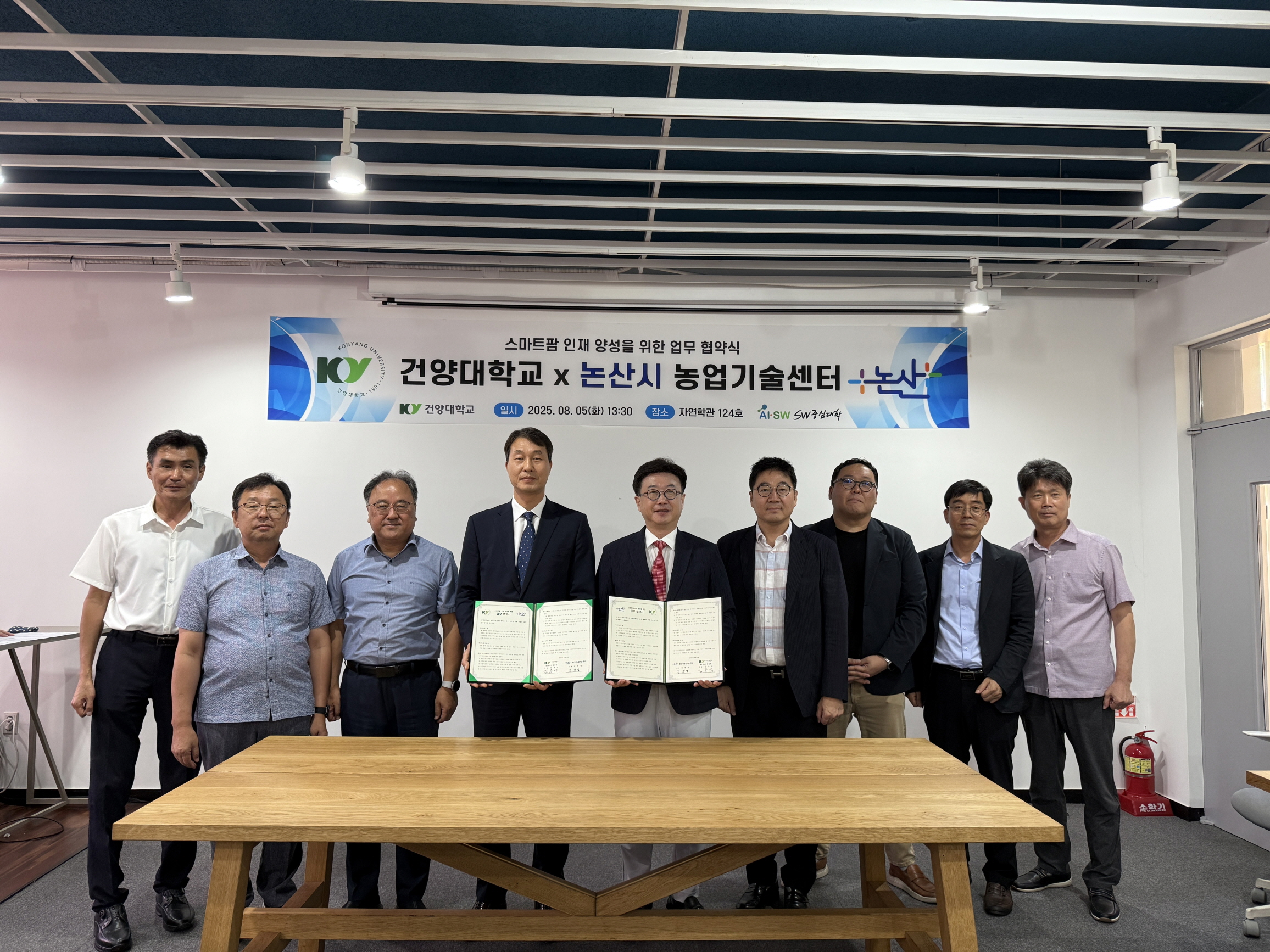건양대학교(총장 김용하) SW중심대학사업단(단장 김용석)은 논산시 농업기술센터(소장 김정필)와 손잡고 스마트농업의 미래를 선도할 혁신적인 업무협약을 체결했다. 2026학년도부터 본격적으로 출범할 스마트팜학부는 농업과 첨단 기술의 파격적인 융합을 예고하고 있다.