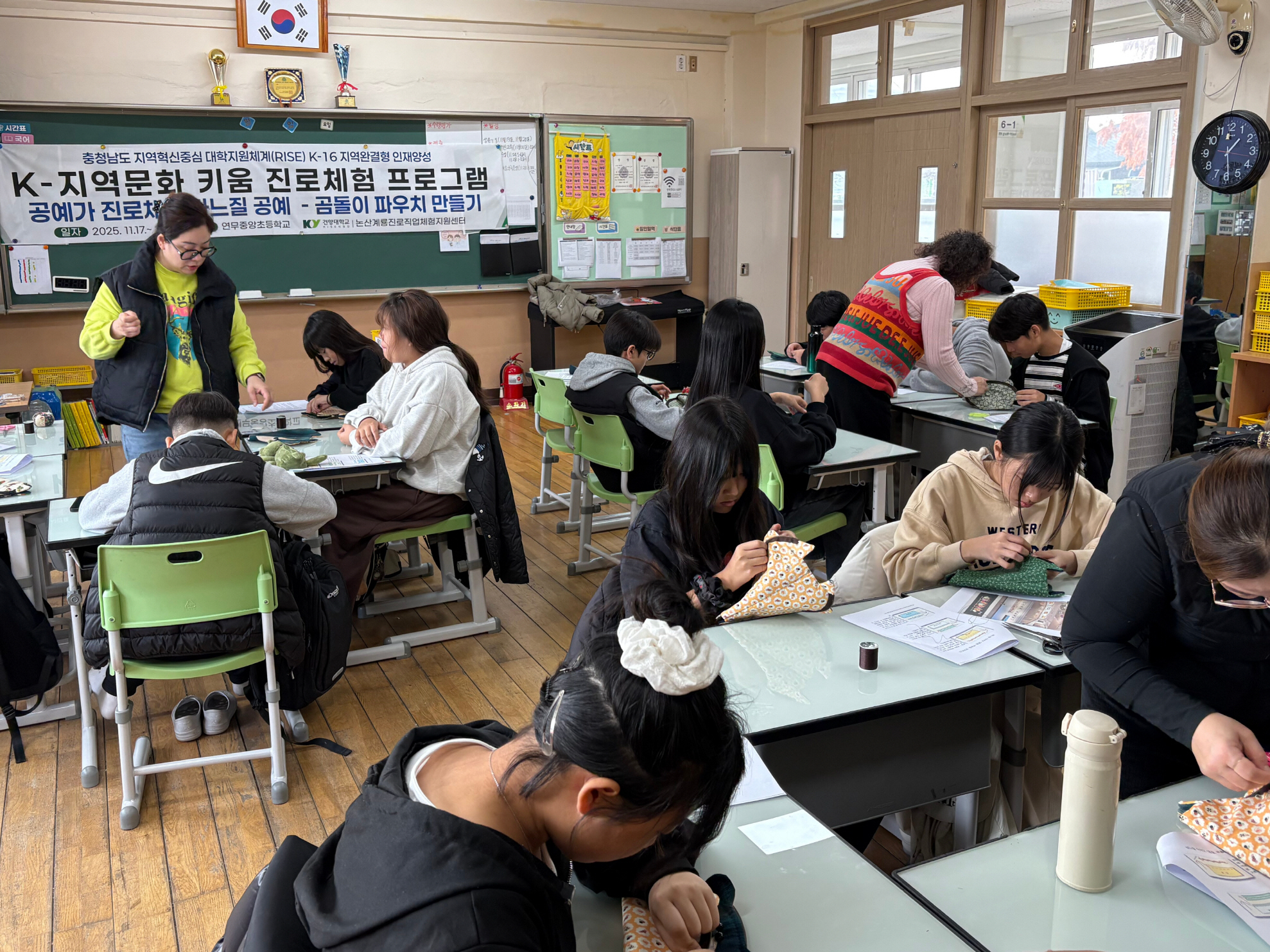 건양대 RISE사업단, 연무중앙초에 'K-지역문화' 꿈과 손재주를 선물하다 건양대학교(총장 김용하) 충남(도지사 김태흠) RISE 사업단(사업단장 겸 대외협력부총장 홍영기)은 2025년 11월 17일부터 11월 28일까지 충남 논산시 연무중앙초등학교 6학년 52명을 대상으로 ‘K-지역문화 키움 진로체험’ 프로그램을 성공적으로 운영했다. 이 프로그램은 충남 RISE 사업 2-2 단위과제인 K-16 지역완결형 인재양성 사업의 일환으로 기획되었으며, 지역 전통문화 체험을 통해 초등학생들의 조기 진로 탐색을 지원했다.