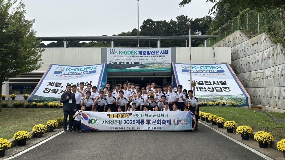 건양대학교(총장 김용하) 군사학과(학과장 지효근)는 9월 19일, 2025 계룡 군문화축제와 제1회 K-GDEX(계룡방산전시회)를 방문해 첨단 국방산업과 변화하는 군 문화를 직접 체험했다. 특히 1학년 학생들이 대거 참여해 미래 군 장교로서의 비전과 국가 안보의 중요성을 깊이 인식하는 의미 있는 시간을 보냈다.